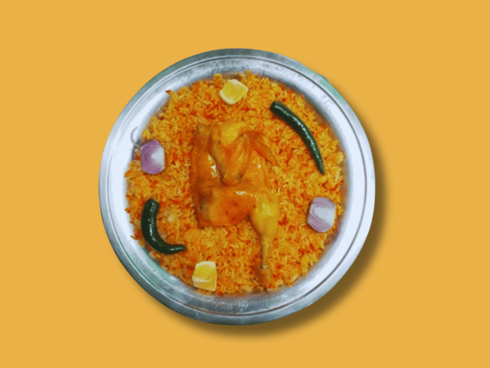دجاجة مندي بلونها الذهبي الجذاب، ناعمة من الداخل ومحمّرة من الخارج.
