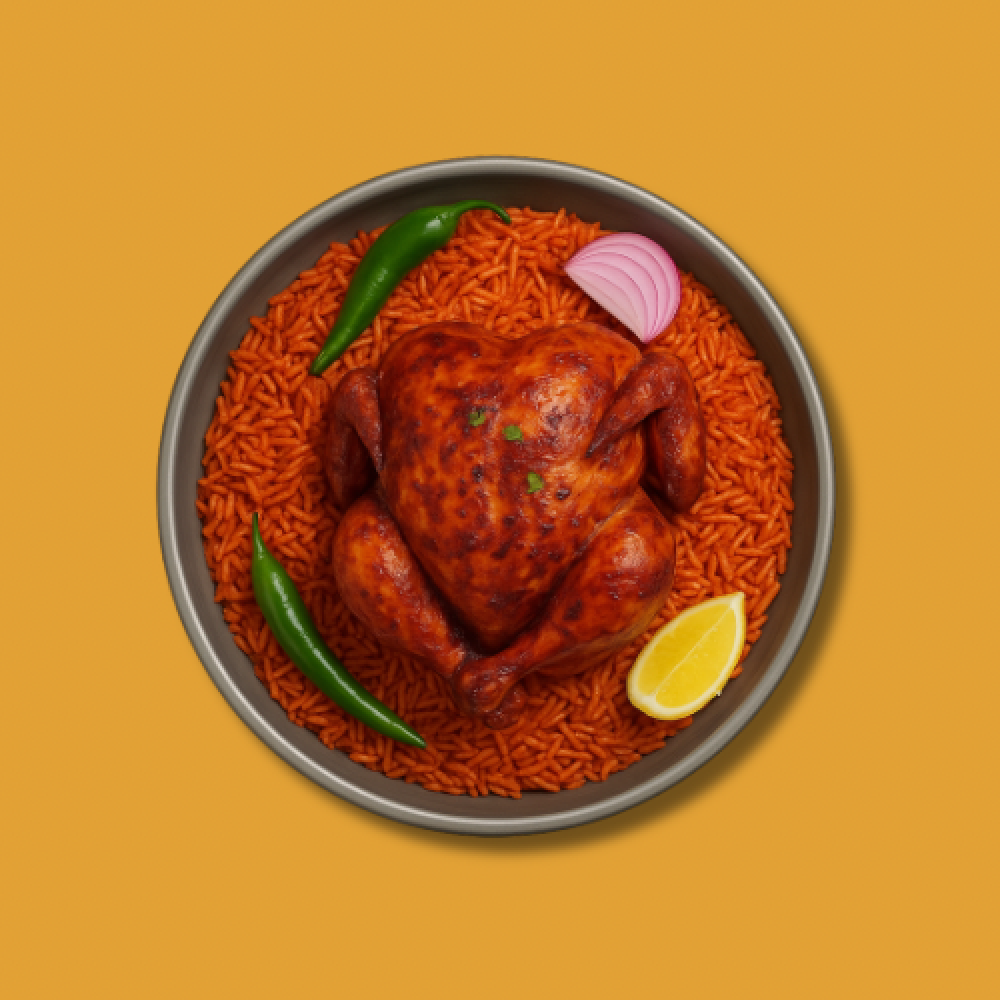 دجاج شواية مستوي بهدوء، مقدم مع رز أبو بنت الأمريكي المعروف بقوامه الخفيف ونكهته المتوازنة.