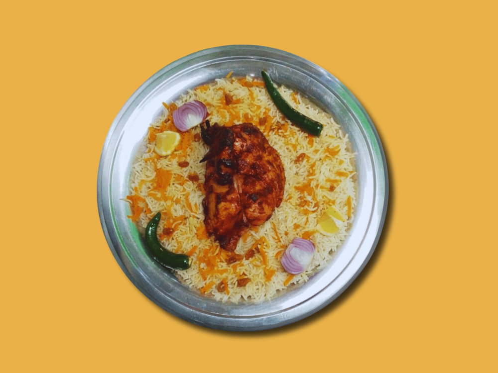 دجاج شواية كلاسيكي على الطريقة المعتادة، مستوي بتوازن ومقدم مع رز مزة مفلفل.